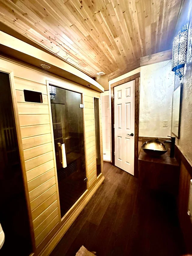 Outdoor gathering restorative spaces with hot tub and infrared sauna